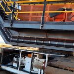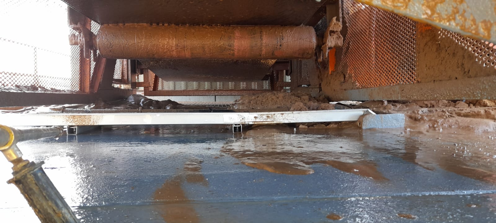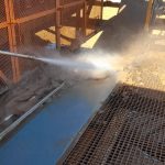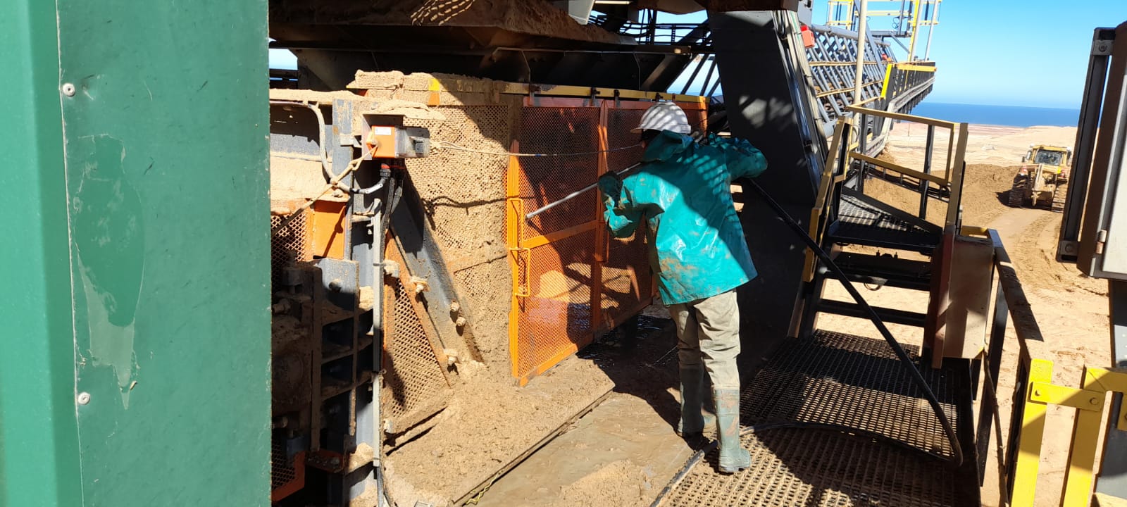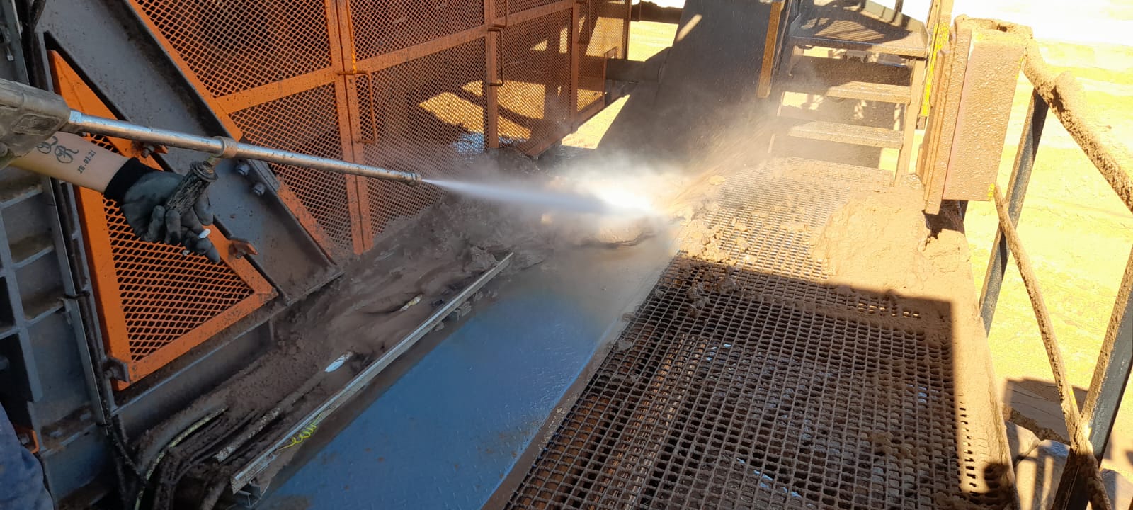 Cleaning of sand spillages under conveyor with High Pressure Spray Wash Machine while conveyor is in motion. Free idlers/rollers from running in sand and cause damages to equipment